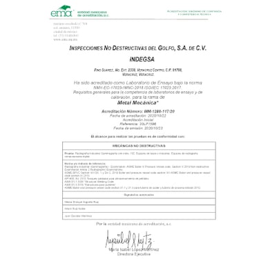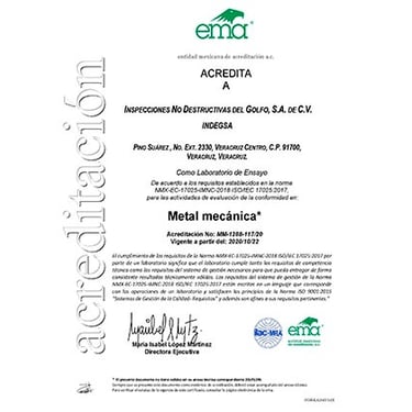 Acreditado como Laboratorio de Ensayo bajo la norma NMX-EC-17025-IMNC-2018 ISO/IEC 17025:2017. Requisitos generales para la competencia de laboratorios de ensayo, para la rama de Metal Mecánica. El alcance para realizar las pruebas es de conformidad con: MECÁNICAS NO DESTRUCTIVAS.